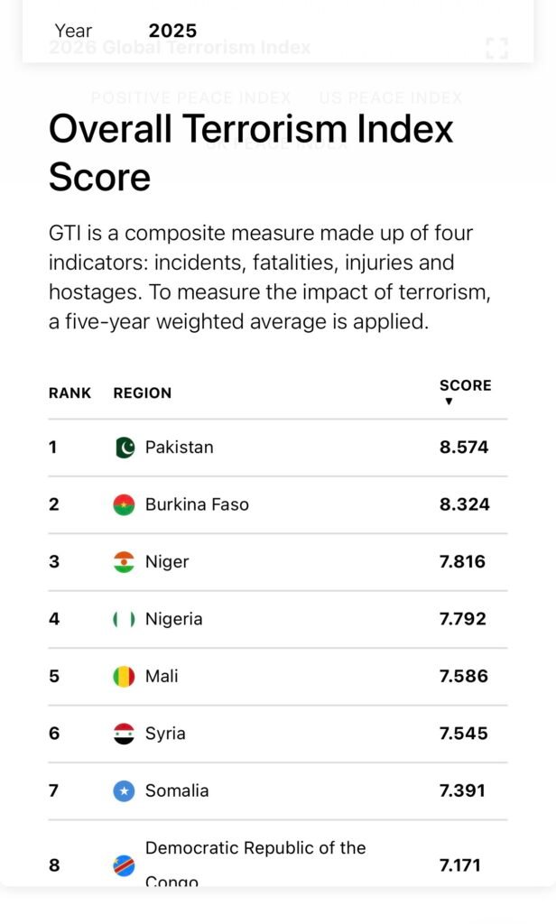 Terrorism deaths in Nigeria increased 46 percent to 750 last year and moved the country to fourth place on the 2026 Global Terrorism Index.