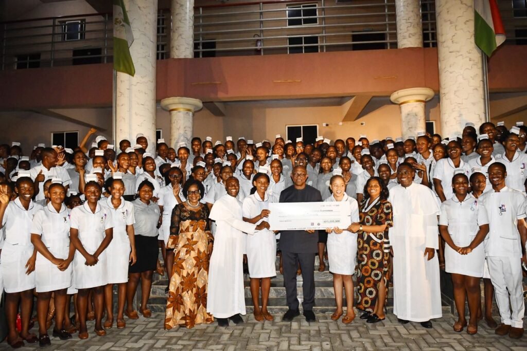 Peter Obi, former Anambra State governor and 2023 Labour Party presidential candidate, hands over a ₦15 million cheque to the College of Nursing Sciences at St. Charles Borromeo Hospital in Onitsha, strengthening healthcare training amid Nigeria’s challenges.