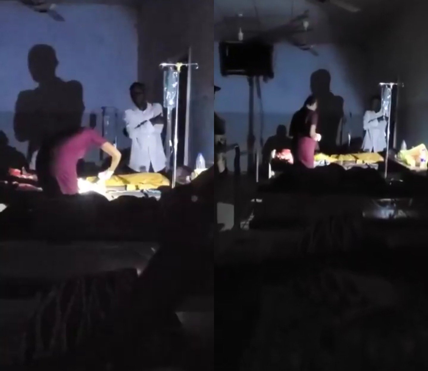 In the clip, staff hold up their phones and shine beams onto beds where patients lie.